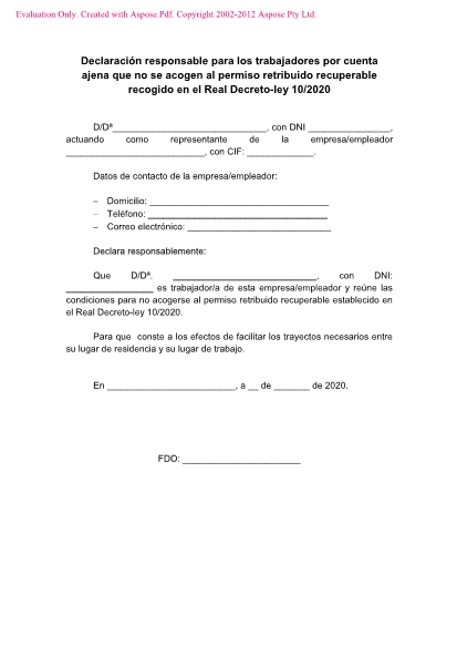 - Model declaració responsable de desplaçament de treballadors per compte aliè no acollits al permís retribuit recuperable.