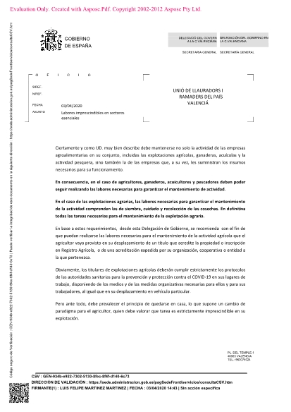 - Comunicació de la Delegació del Govern a LA UNIÓ indicant les activitats agràries imprescindibles.