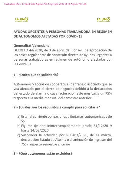 - REsum del Decret de la Generalitat Valenciana de concessió directa d’ajudes urgents a persones treballadores en règim d’autònom afectades per la Covid-19, punxant aquí (No entren els autònoms del sector agrari)