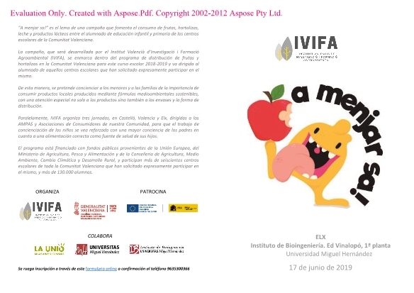 El Institut Valencià d'Investigació i Formació Agroambiental (IVIFA) -fundació creada per LA UNIÓ de Llauradors- organitza tres jornades de sensibilització a Elx, Castelló i València dirigides a les AMPAS i associacions de persones consumidores perquè el treball de conscienciació dels escolars es veja reforçat amb una major consciència dels pares quant a una alimentació correcta com a font de salut dels seus fills. En aquestes jornades intervindran representants de les Universitats (Universitat Miguel Hernández, Universitat Jaume I i Universitat Politècnica de València, nutricionistes, representants de la cooperativa Consum, de AVACU i de Conselleria d'Agricultura.